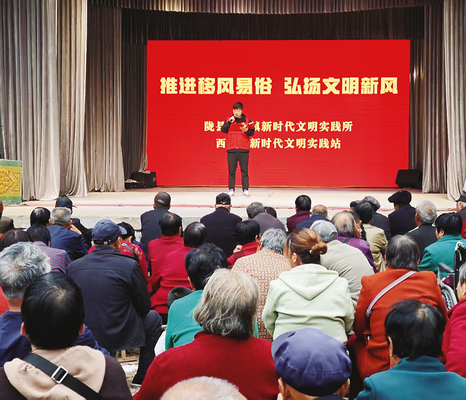 近年来,宝鸡市依托新时代文明实践中心(所、站),吸纳道德模范等,组建移风易俗宣讲队1300余支,选聘新时代文明实践宣讲师381名,开展“文艺展演+政策解读+家风分享”。今年常态化进村入户宣讲6800余场次,营造了“全域覆盖”的浓厚氛围,凝聚起全民参与的文明合力。