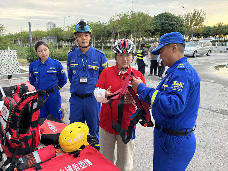 9月24日,天津滨海蓝天救援队东疆工作站工作人员为记者介绍救援设备。新华网 于珊 摄
