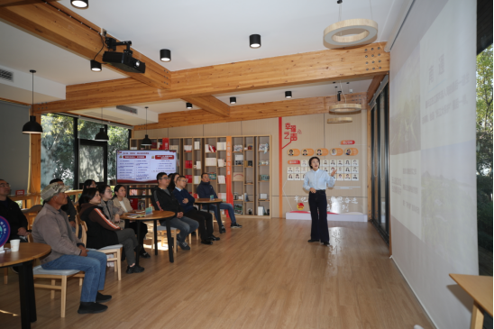 11月22日,在南通市崇川区狼山镇街道“幸福之声”的理论宣讲工作室内,志愿者讲解员正在讲述费长中默默守护长江的故事。新华网发(江建华 摄)
