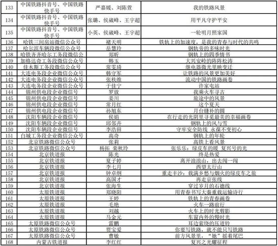 打印:12月30日,由中宣部文明创建局、中央网信办网络传播局、中国作协创联部、中国国家铁路集团有限公司党组宣传部联合举办的“我的铁路风景”故事汇原创美文征集展示活动优秀作品名单公布,共252件。